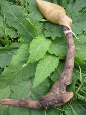 | | NAMENLOS Die Rassel ist ca. 45 cm lang, mit einem Rasselkopf aus Hirschrohhaut. Auf dem Rasselstab finden sich viele Käferspuren, die dort ihre Geschichten eingewebt haben. Sie hat einen zarten hellen Klang und freut sich auf ihren Hüter. Preis € 47,00 zzgl. Versandkosten nach Auslage. |